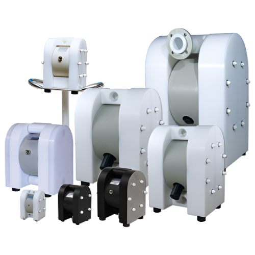 ปั๊มไดอะแฟรม diaphragm pump แบรนด์ TAPFLO (แท็ปโฟล) รุ่น PE & PTFE series ตัวปั๊มเป็นพลาสติกที่สามารถเพิ่มเติม อุปกรณ์ได้ตามความต้องการ มีไซส์ขนาดที่กะทัดรัด โดยวัสดุที่ผลิต ได้แก่ PE และ PTFE ปั๊มไดอะแฟรม PE มีความทนทานต่อการสึกหรอมากถึง 6-7 เท่า เมื่อเทียบกับ ปั๊มไดอะแฟรม PP และ 1.5 เท่า เมื่อเทียบกับเหล็ก เหมาะสำหรับใช้กับของเหลวที่มีตะกอน ปั๊มไดอะแฟรม PTFE สามารถทนทานต่อของเหลวที่มีฤทธิ์เป็นกรดรุนแรง หรือมีความเข้มข้นสูง เช่น กรดไนตริกเข้มข้น สามารถทนต่อการสึกหรอได้อย่างดีเยี่ยม